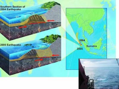 利用声爆(小图),研究人员分析了两次苏门达腊地震震源区的海底岩层特性。(图片...