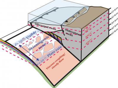一个俯冲带的块状模型,去掉了一部分前弧,露出了下降板块的顶部。红色虚线是等温线...