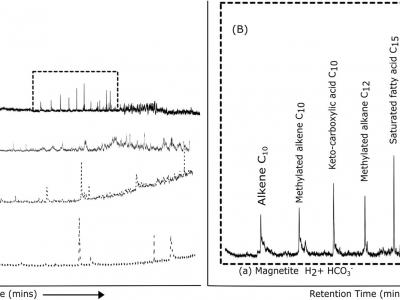 与对照相比,水热反应后磁铁矿的总离子色谱图。将磁铁矿与HCO3和H2在90°C和16 bar...