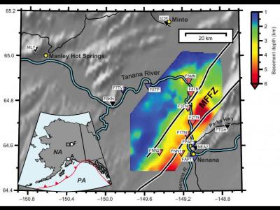 这张地图显示了阿拉斯加中部的内纳纳盆地和明托平原断裂带。颜色表示盆地基底表面的...