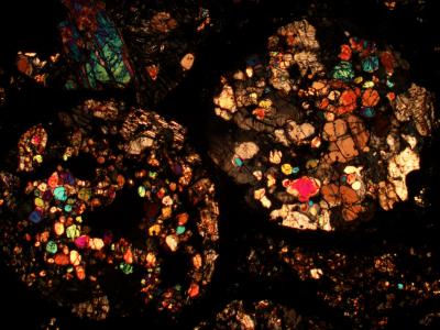 显微镜下的陨石薄片。不同的颜色代表不同的矿物,因为光以不同的方式穿过它们。圆形...