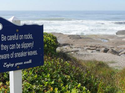 俄勒冈州雅查特市的一个标志警告游客注意球鞋潮。(Credit: Tiffany Woods, Oregon ...