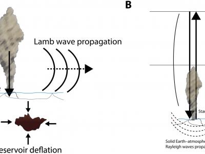 喷发期间促成地面运动的主要机制的示意图。(A)喷口喷射产生的向下反作用力(建模...