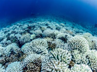 于2019年海洋热浪期间,莫雷阿岛北岸深处发生了大面积珊瑚白化事件(CREDIT:Peter J...