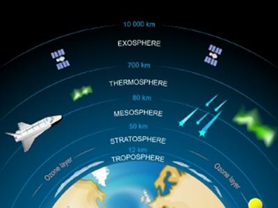 地球大气层的垂直结构示意图,可大致分为对流层、平流层、中间层、热层和散逸层(蜘...