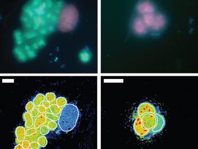 淡水Cadagno湖中的紫硫细菌(上图,绿色和紫色),以及用nanoSIMS测量的其单细胞固...