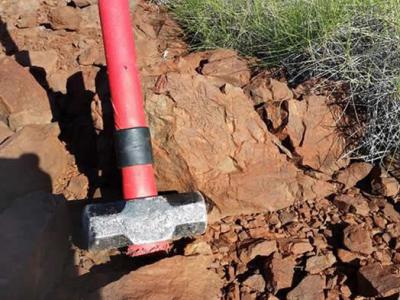 澳大利亚皮尔布拉的科马提岩,年代为32.7亿年前。岩石中细长的晶体——质地类似附近...