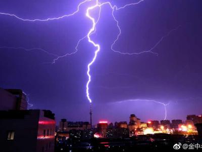 2017年7月7日击中中央广播电视塔的闪电(拍摄者:钟魁润 《中国科学》杂志社)(蜘...