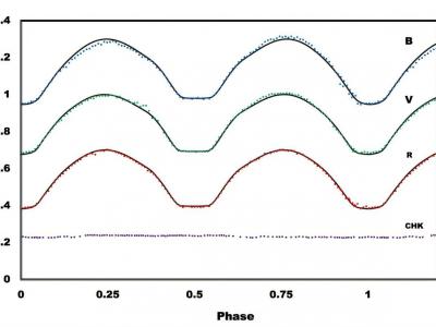 观测和模拟了仙女座 V 717 的光变曲线。蓝色曲线表示 B 波段、绿色、V 波段和红色 ...