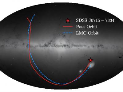 运动学特性。J0715 − 7334 的过去轨道和 LMC 在天空中的银河系坐标,叠加在盖...