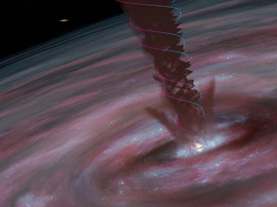 艺术家的印象:螺旋风在磁场的帮助下帮助ESO320-G030星系中的超大质量黑洞成长。在...