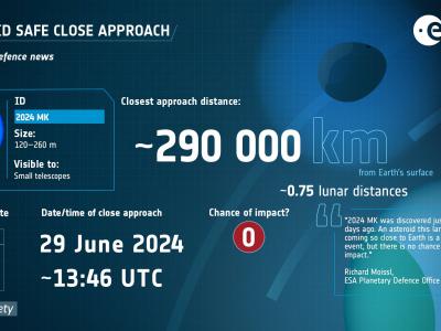 小行星2024 MK将于6月29日世界时13:45左右(中部时间15:45)掠过地球。它的直径在1...