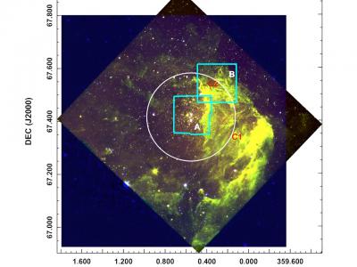 Berkeley 59区域的三色图像(红色:4.5µm,绿色:3.6µm,蓝色:CFHT Meg...