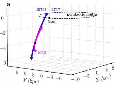 J0731+3717和梅西耶15球状星团向后轨道的三维表示。资料来源:Huang et al.,2024。...