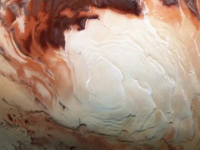 2012年12月,欧洲火星快车航天器拍摄到了这张照片中的亮白色区域,显示了覆盖火星南...