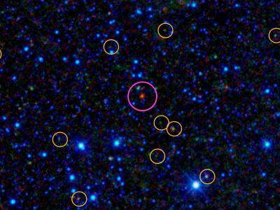 新的研究表明,像紫色圆圈中的星系一样,炽热的尘埃遮蔽星系(Hot DOG)可能与被称...