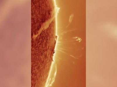 日冕物质抛射与太阳色球层的混合图像。图片来源:SOHO—ESA & NASA(蜘蛛网eeo...