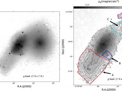 左图:来自CFHT/MegaCam的VCC322/319的1′.8×1′.8 g波段图像。右图:VCC322的1.′...