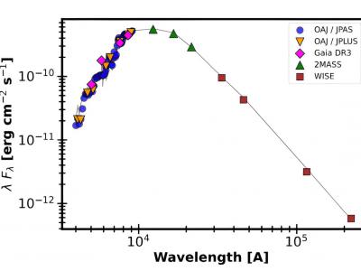 最适合VOSA TOI-1685的SED。彩色点是来自Gaia、2Mass和WISE调查的光度星等,以及从...
