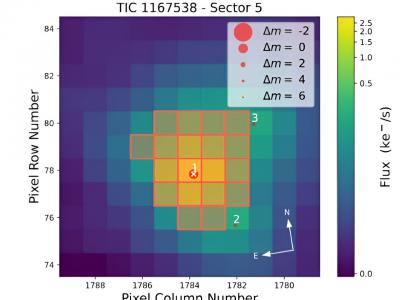 TESS扇区5的目标像素文件(TPF),TIC-1167538(=TOI-2447/NGTS-29)用白色十字标记...