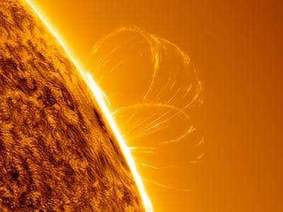 一圈圈等离子体沿着磁力线从太阳上盘旋而出。(图片来源:Eduardo Schaberger Poup...