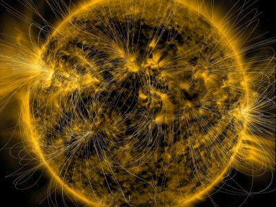 这幅图描绘了美国国家航空航天局太阳动力学观测站拍摄的太阳磁场。复杂的线条叠加可...