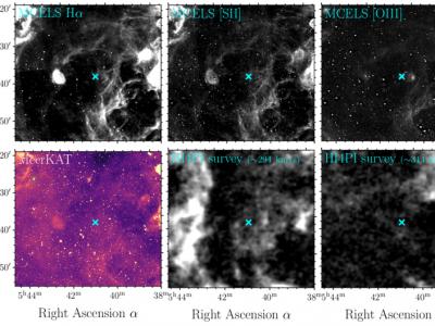 大约 40×40 角分的视场显示了 LMCN 1971-08a 周围的新星超级残余物,在不同的调查...