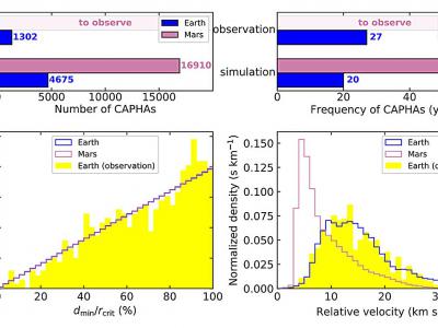 左上(右)面板:从模拟和实际观测中获得的地球CAPHA和火星CAPHA的数量(频率)。左...