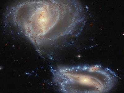 两个被称为NGC7733和NGC7734的棒旋星系正在合并过程中。较低星系的上臂上有一个尘土...