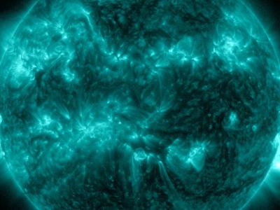 太阳的假彩色图像,以蓝绿色显示,从其表面喷出漩涡状的耀斑。(图片来源:NASA/SD...