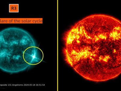GOES-16卫星(左)和美国国家航空航天局太阳动力学天文台(右)拍摄的5月14日太阳耀...