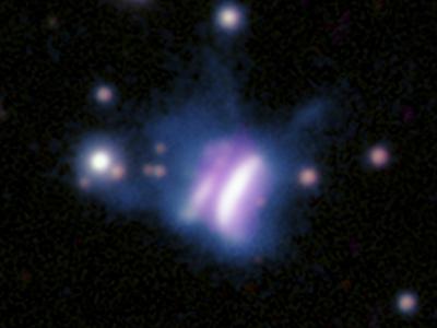 这张由研究人员于2024年5月提供的合成无线电和光学图像显示了IRAS 23077,中心,一...