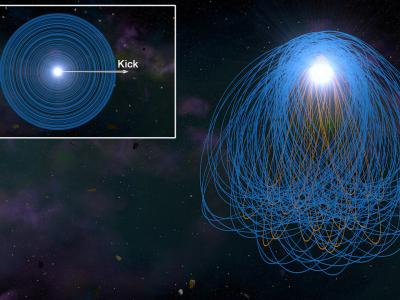 小行星围绕白矮星运行。最初,每个小行星都有一个圆形的前进轨道。撞击形成了一个偏...