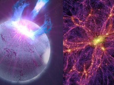 (左)中子星的插图(右)艺术家对暗物质分布的印象。(图片来源:美国国家航空航天...