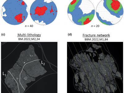 温科姆陨石碎片的代表性μCT切片和在下半球立体投影上绘制的球粒长短形状轴上的轮廓...