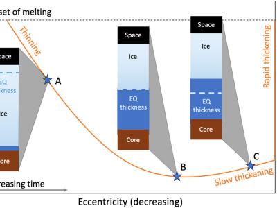 Mimas冰壳演化的说明,其中冰壳厚度(y轴)的变化滞后于离心率衰减(反向x轴)。时...