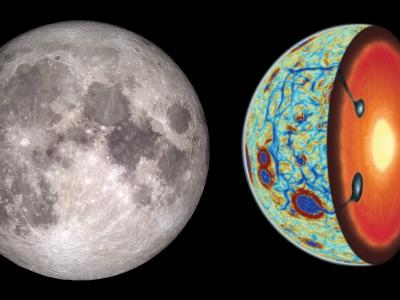 (左)月球的详细图像(右)月球左侧重力梯度图和横截面示意图,显示了月球地幔翻转...