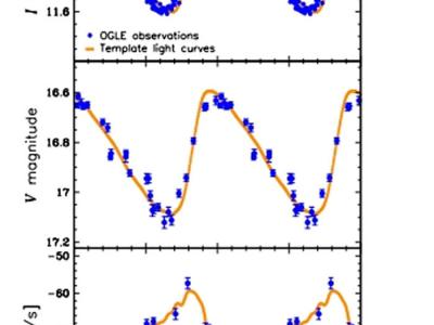 来自盖亚聚焦产品发布的OGLE-GD-CEP-1884的相位折叠I波段(上图)和V波段(中图)O...