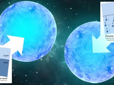 白矮星内部的两个替代模型并排放置。(左)标准白矮星的普通结晶。(右)以蒸馏为主...