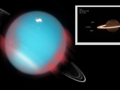(主)哈勃望远镜看到的天王星,添加了极光并用红色标记(插图)JWST看到的土星极光...