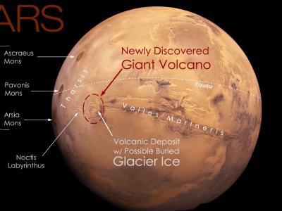新发现的巨型火山位于火星赤道附近。上图中,它与该行星塔尔西斯地区发现的其他火山...