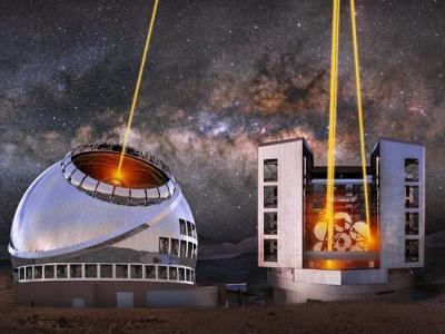 一位艺术家在打开激光引导星(LSG)的情况下对US-ELTP三十米望远镜(TMT)(左)和...