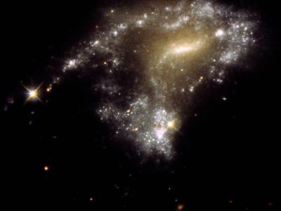 在这张美国国家航空航天局·哈勃太空望远镜拍摄的照片中,星系AM 1054-325由于受到...