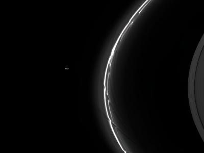 卡西尼号飞船拍摄的牧羊人卫星潘多拉和普罗米修斯(每个直径约80公里)对土星F环的...
