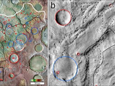 火星上一个未命名的山谷网络的细节。撞击坑用蓝色和红色圆圈标记。红色标记的环形山...