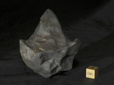 具有不规则表面特征的Aguas Zarcas陨石。这块146克重的石头是迈克尔·法默借给布塞...