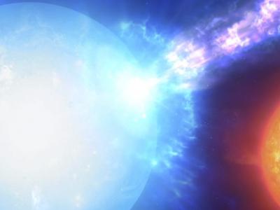 这位艺术家的概念展示了一个假设的事件,称为超千新星。一颗大质量恒星在超新星爆炸...