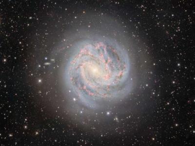 1200万光年外的梅西耶83,也被称为南风车星系。其旋转的旋臂显示出高恒星形成率,并...