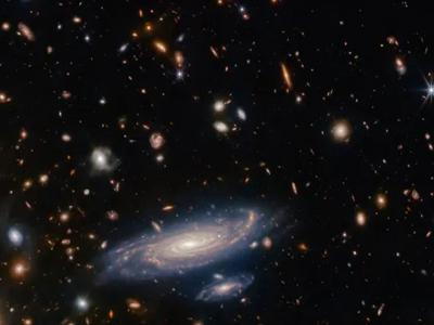 一个明亮的螺旋星系出现在数千个其他遥远星系的背景上(图片来源:NASA/ESA/JWST)...