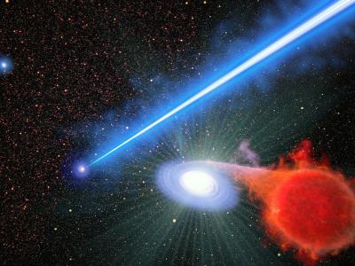 蓝色激光束从黑洞中射出并穿过双星系统的图示(图片来源:美国国家航空航天局、欧洲...
